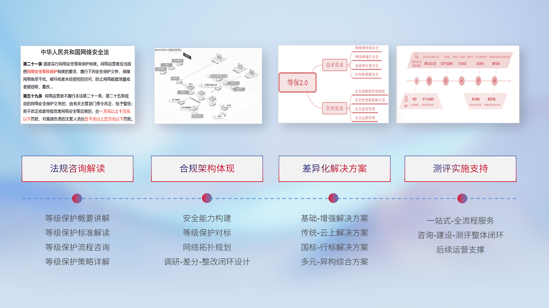 通过专业的法律咨询解读、、、合规架构体现、、差异化解决方案、、、、测试实施支持等服务,,为客户量身打造等保合规体系。。。。