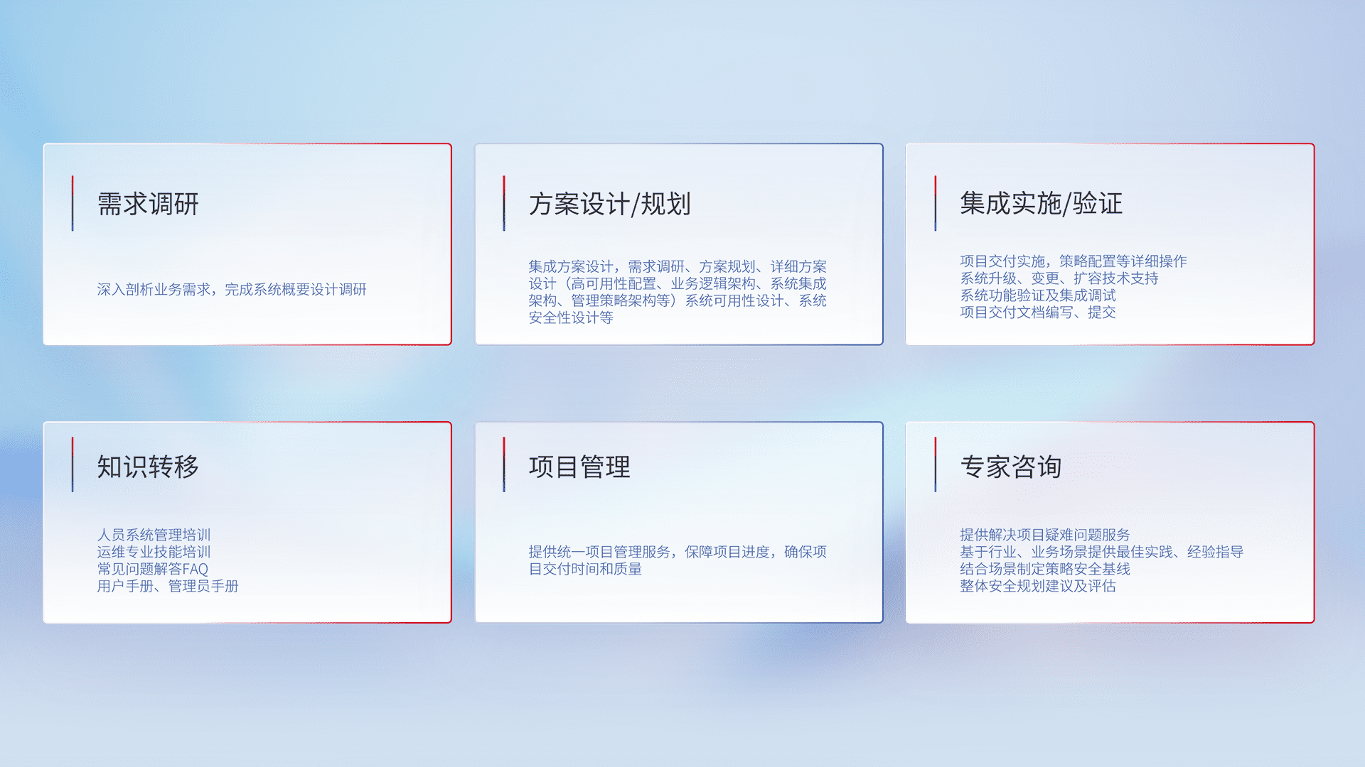 针对客户行业特性,,将宏观的安全战略和需求,,,通过专业的交付服务,,实现项目落地,,,,为客户提供标准规范的集成交付服务。。